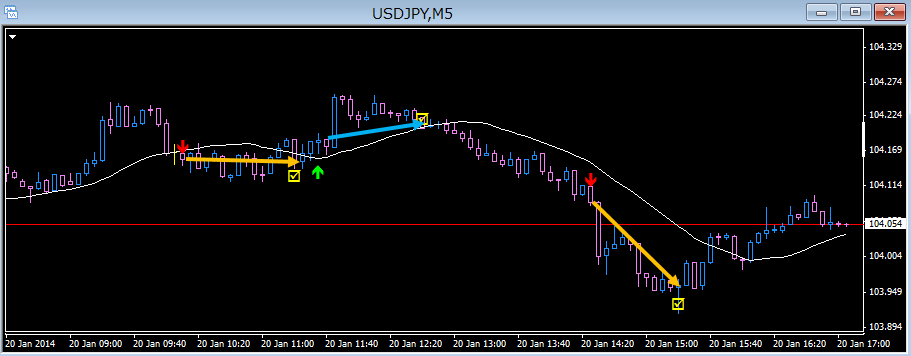 1分足では、買いのシグナルと売りのシグナルは、短期波動に合わせて、