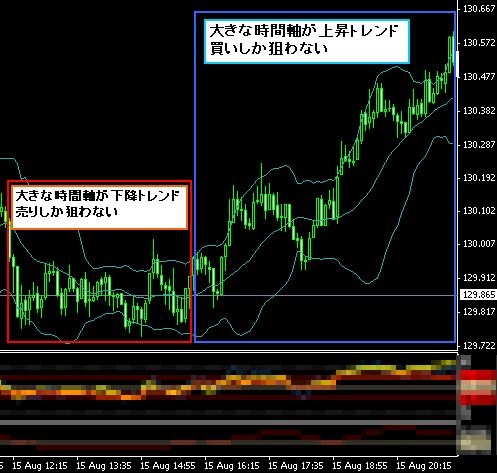 簡易的なマルチタイムフレーム分析をしてから仕掛けることになります。